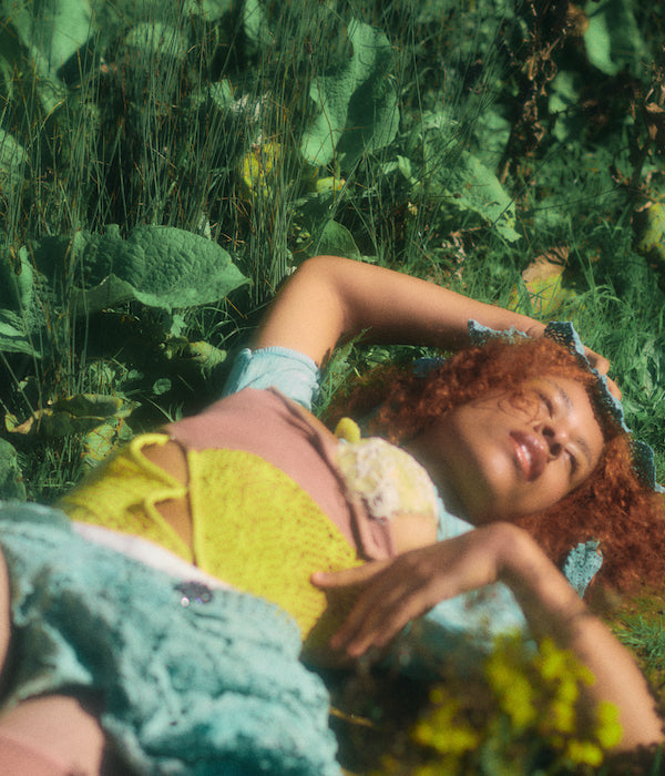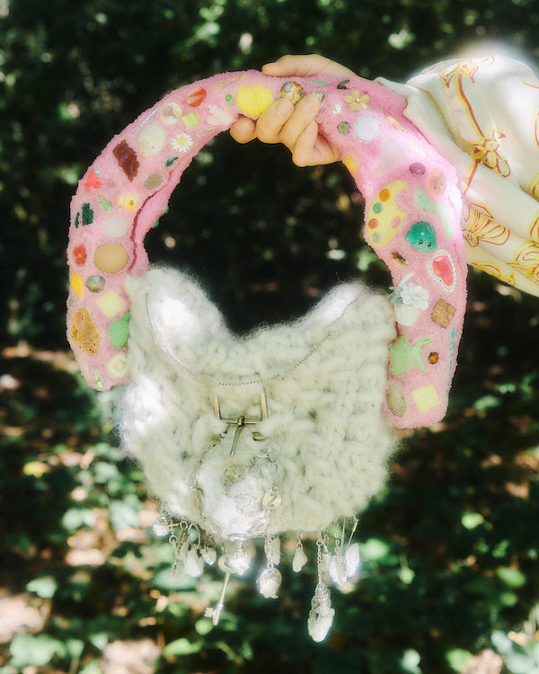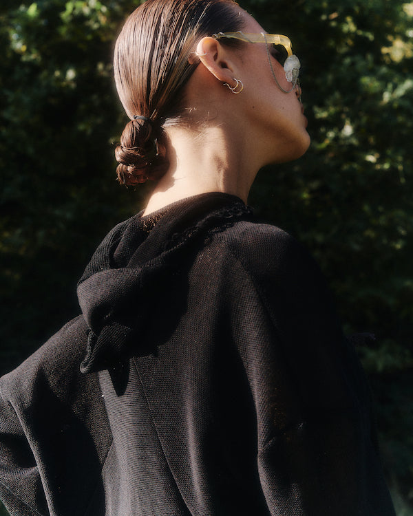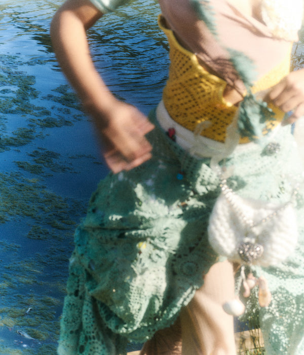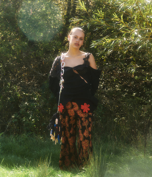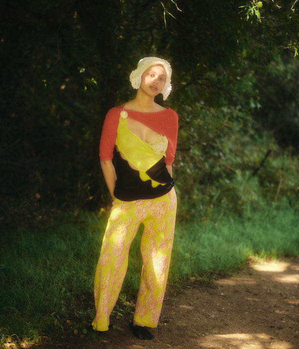 References to the 18th and 19th century are juxtaposed by a backdrop of modern innovation seen throughout the collection. Most recognizably is Rubens’s continued collaboration with Post Carbon Lab, enabling parts of the collection to photosynthesize. All photosynthesis coated pieces have a recognizable green hue and give off oxygen and absorb carbon dioxide. These require indirect sunlight and regular misting to maintain their climate positivity, similar to a house plant. New this season is collaboration with material storyteller, Coline Le Quenven, to develop bag handles and trims using unconventional materials like melted CD cases and bottle caps, biodegradable corn-based plastic, upcycled chains and trinkets, and found objects, toys, and seashells. The collection is a rich collage of quirks, signature to Olivia Rubens each season.